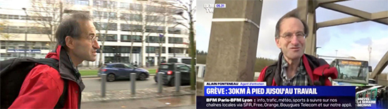 經過諸多媒體的報道后,就有記者找到阿蘭·馮特諾,經采訪得知他家住伊夫林省拉韋里耶爾鎮(zhèn)。在公交系統(tǒng)罷工已經持續(xù)多日的情況下,與很多大巴黎地區(qū)的居民一樣,他下班返家面臨極大困難。上班時,他通常每天早上6點半開始以分時段的方式工作,有時下班時間是晚上8點。罷工開始后,他與公司協(xié)商后將上班時間提前至早上6時,這樣他每天就可以從家中乘坐一趟夜班車進城。至于下班后通勤就變得異常棘手了。而他只有兩種選擇,第一種就是步行至巴黎蒙巴納斯火車站乘坐遠郊鐵路N線或U線。但罷工期間,這些線路只在下午4點半后才開始恢復運行;而第二種選擇就是全程步行回家,距離是30公里。徒步需然后先后穿行圣西爾、圣康丹、特拉普等市鎮(zhèn),然后才回到拉韋里耶爾鎮(zhèn)的家中。
